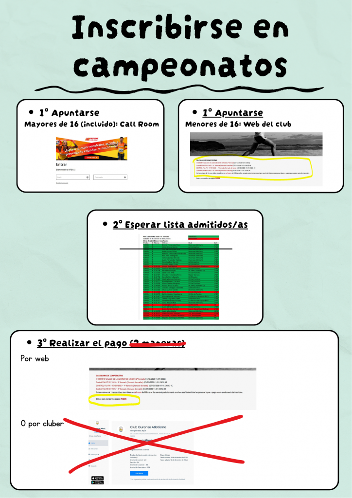 Os/as maiores de 16 anos deben inscribirse no call room da RFEA e se lles enviará posteriormente o enlace aos/á admitidos/as para que fagan o pago cando exista cuota de inscrición.